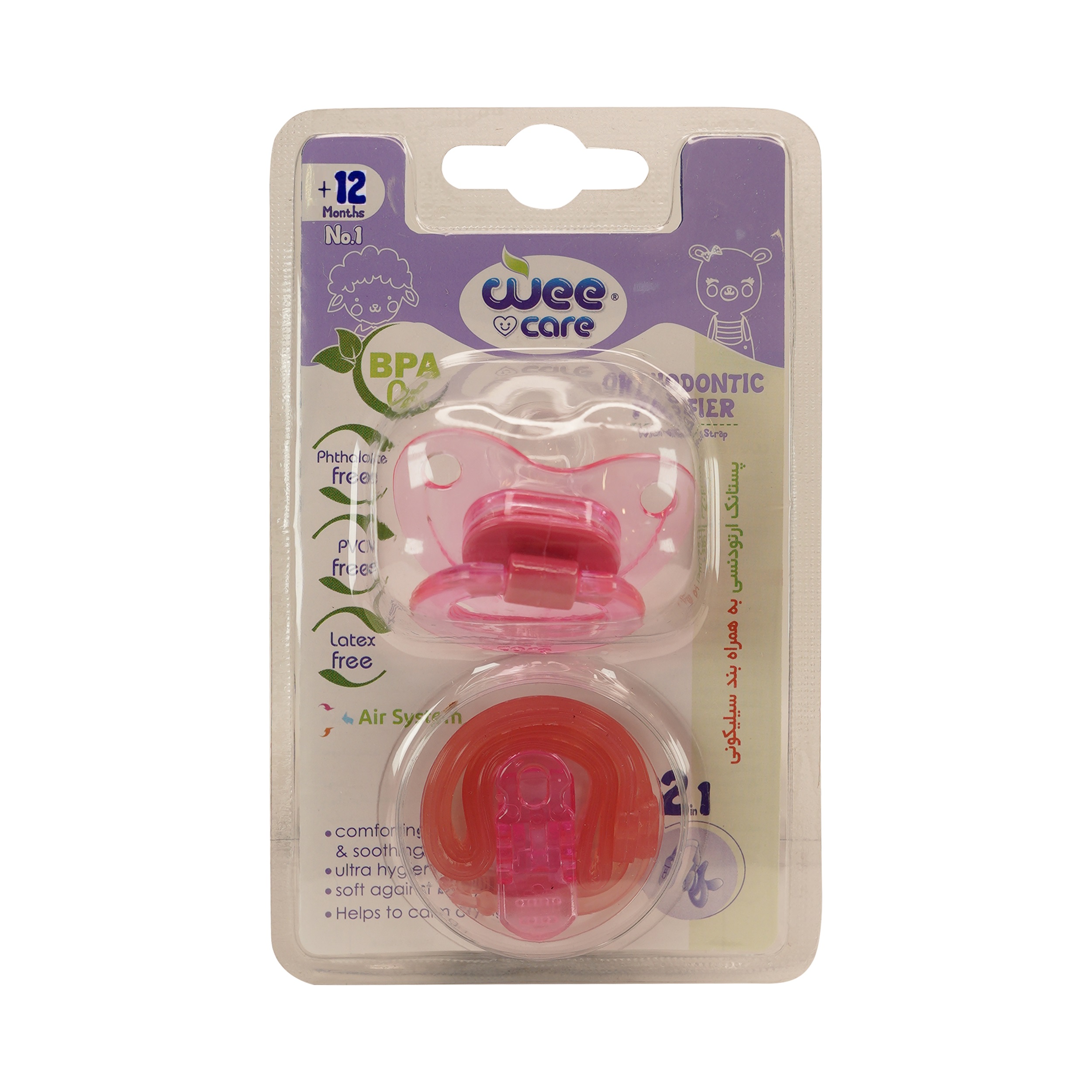 پستانک ارتودنسی وی کر مدل بند دار شفاف، ساخته شده از سیلیکون با گرید دارویی و ضد حساسیت، با طراحی ارتودنسی برای رشد طبیعی دندان و فک کودک. مجهز به بند و گیره مقاوم برای اتصال آسان به لباس.