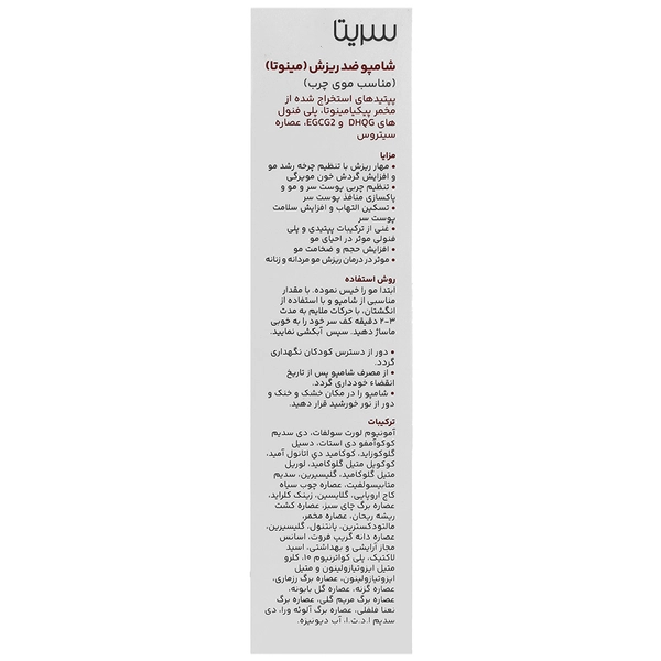شامپو ضد ریزش مینوتا موهای چرب سریتا حاوی عصاره دانه سیتروس گراندیس است که با تنظیم چربی پوست سر، باعث پاکسازی عمیق و موثر منافذ پوست سر میشود. این شامپو با افزایش گردش خون مویرگی و تنظیم چرخه رشد مو در درمان ریزش مو مردانه و زنانه موثر است. این محصول از ترکیبات پپتیدی و پلی فنولی غنی شده که به ترمیم و احیای مو و همچنین افزایش حجم و ضخامت موها کمک میکند. گفتنی است در ساختار شامپو مینوتا از پارابن استفاده نشده است.