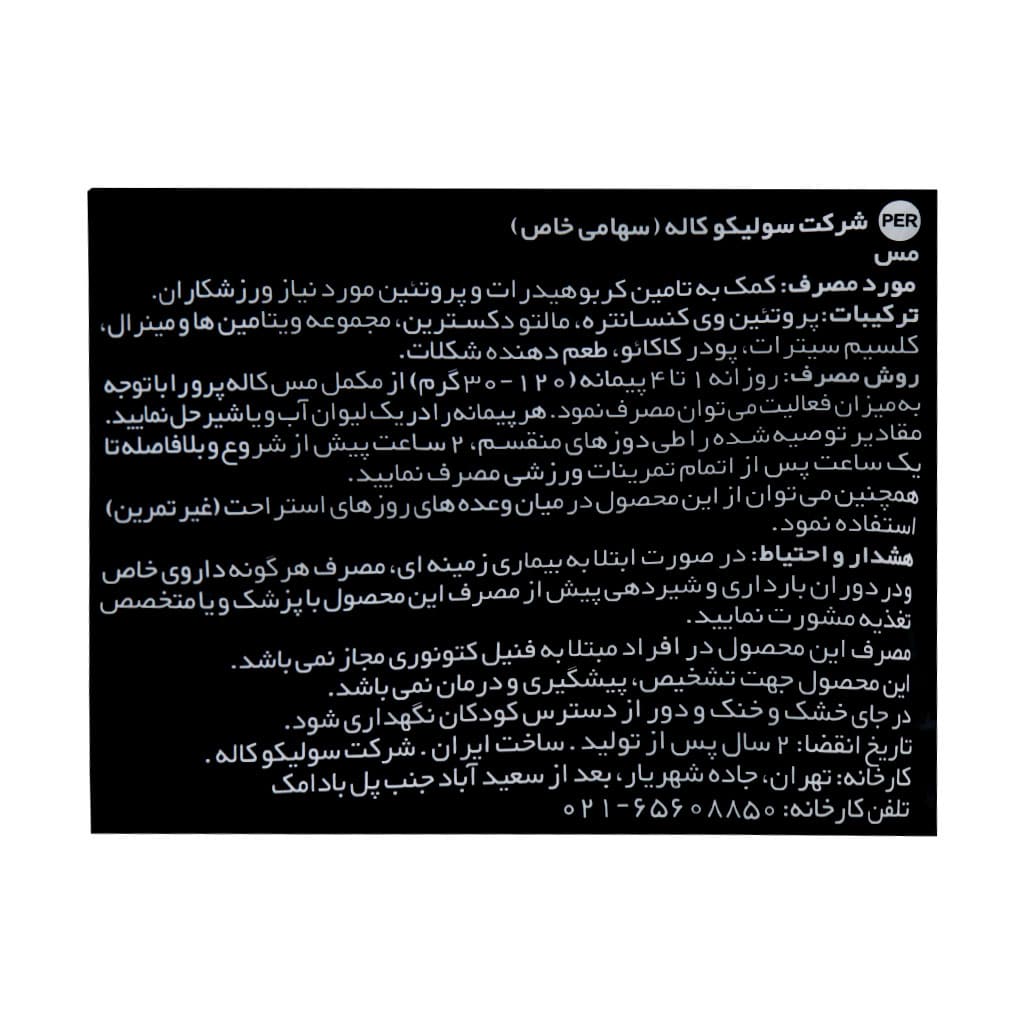 - 41 درصد پروتئین وی باکیفیت بالا: میزان پروتئین موجود در مس کاله یک انتخاب مناسب برای افرادی است که به دنبال ساخت عضلات قوی و بدون چربی هستند. به سرعت در بدن جذب میشود و فرایند بازسازی عضلات را پس از تمرینات سنگین و پر شدت بهبود میبخشند. همچنین به حفظ توده عضلانی در طول دورههای استراحت کمک میکنند.