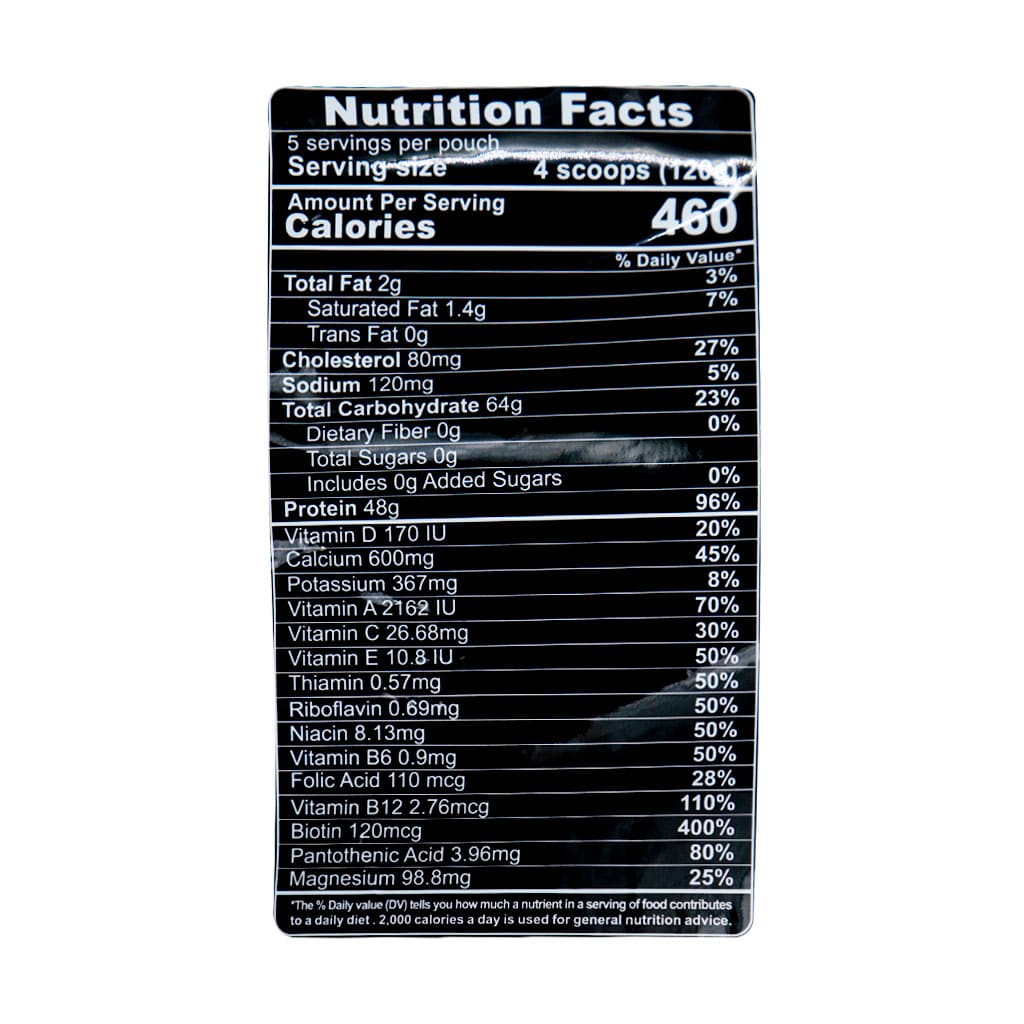 پروتئین وی کنسانتره، مالتودکسترین، مجموعه ویتامینها و مینرال، کلسیم سیترات، پودر کاکائو، طعم دهنده شکلات.